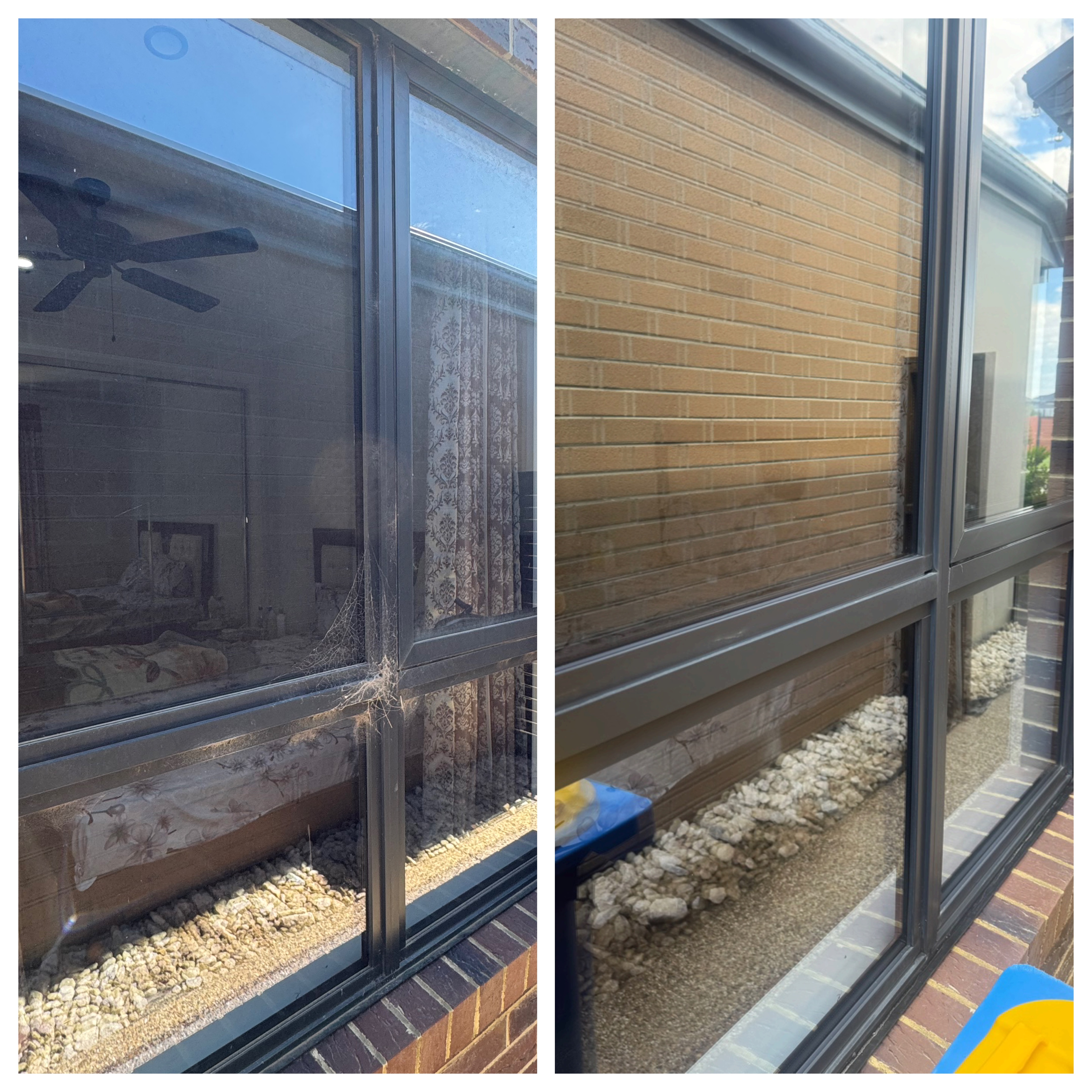 Window cleaning of exterior and interior panes of glass. This includes tracks, frames, sills, ledges, and fly screens